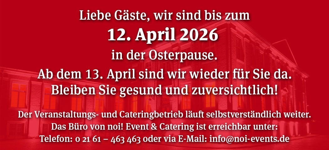 Liebe Gäste, „Kette & Schuss“ ist vom 24.07. bis 06.08. in der Sommerpause. Ab dem 07.08. sind wir dann wieder für Sie da. Unser Catering- und Veranstaltungsbetrieb läuft in dieser Zeit selbstverständlich weiter, das Büro von noi! ist ebenfalls wie gewohnt...